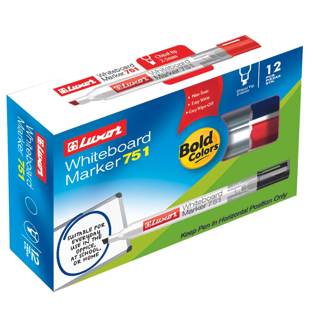 Premium Luxor 751 whiteboard markers - professional pack of 12 pieces in bold colors. Excellent for offices, schools, and educational institutions in Kenya. Features easy wipe-off ink, smooth writing performance, and vibrant colors that stand out on whiteboards. Reliable quality for daily classroom and office use.