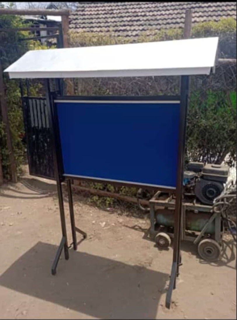 Premium standalone noticeboard with protective canopy and combination display surface. Features dual functionality with fabric pinboard section and magnetic dry erase whiteboard surface. Portable freestanding design with durable metal frame perfect for outdoor events